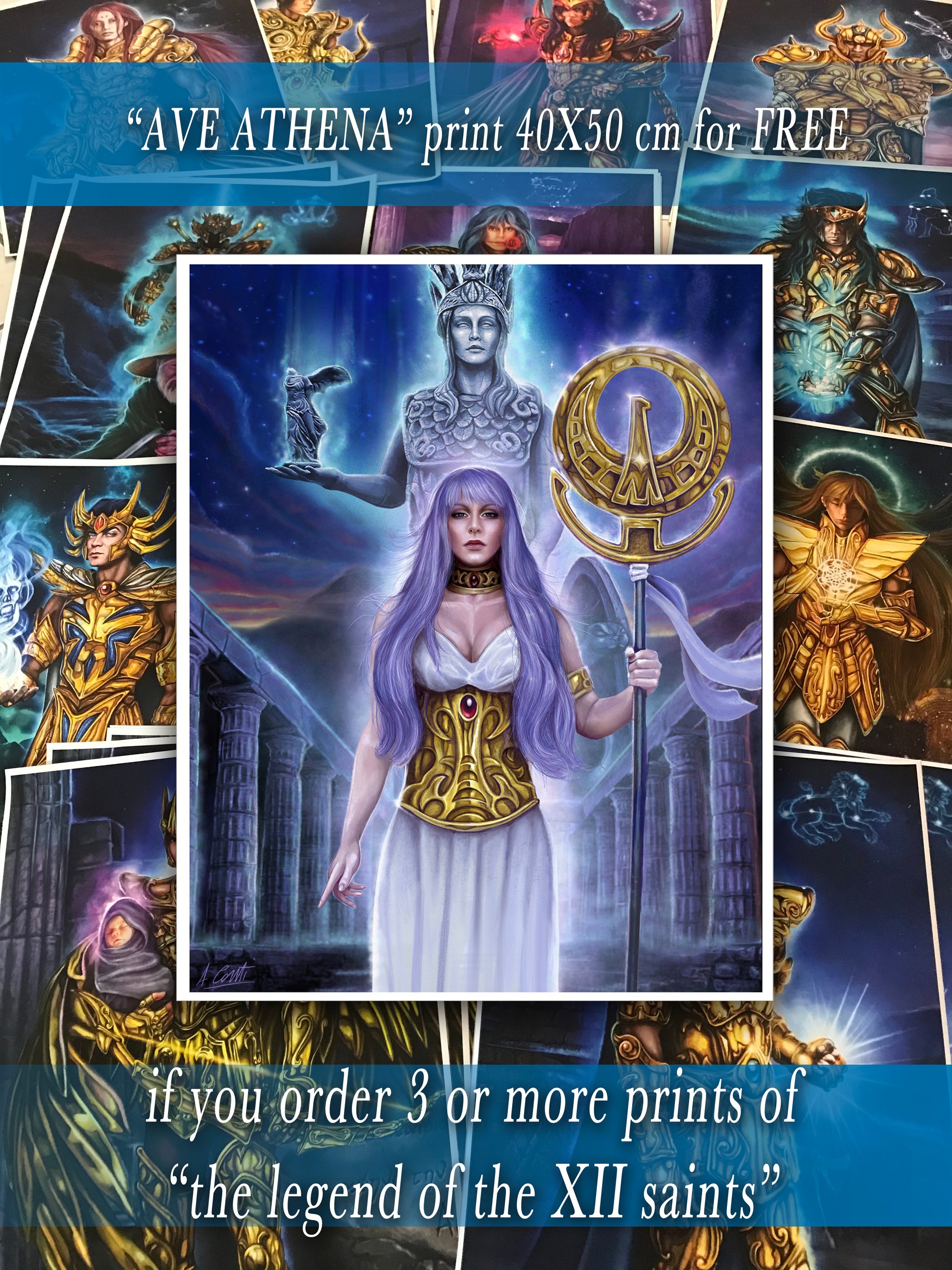 - If you order 3 or more prints of the series "THE LEGEND OF THE XII SAINTS", you'll receive a prints of "ATHENA" for free!
